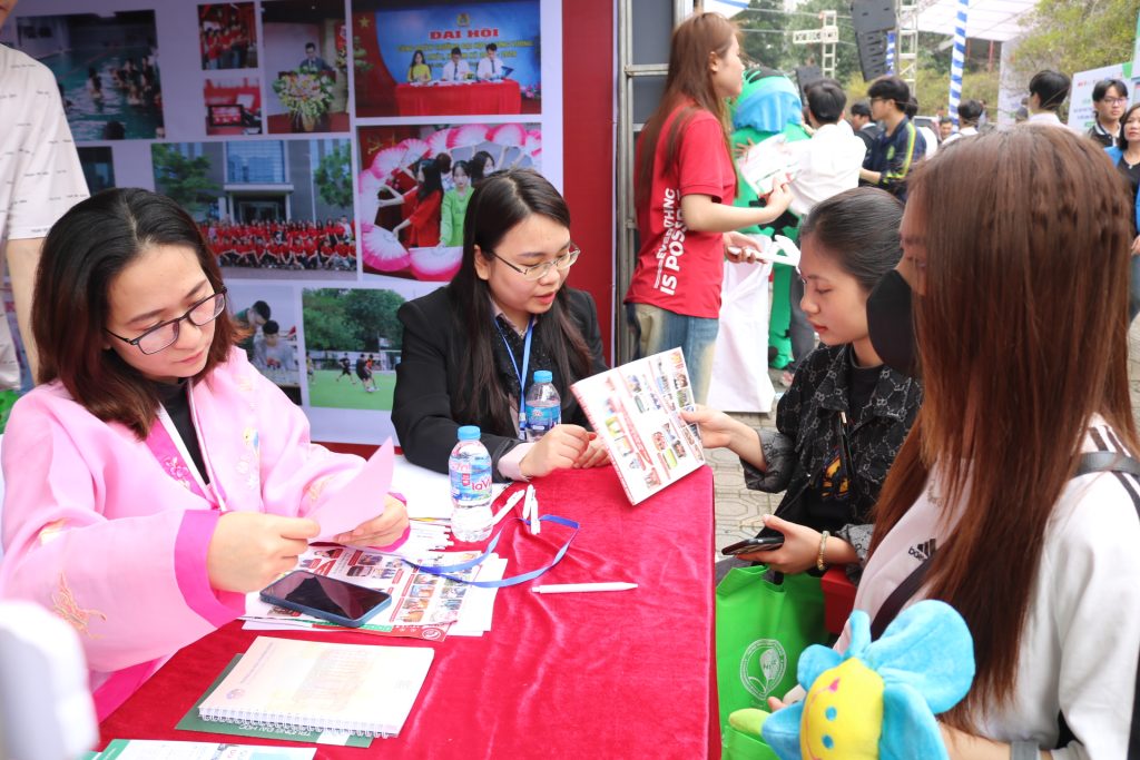 Hòa chung không khí sôi động ấy, gian hàng tư vấn của Trường Đại học Trưng Vương vui mừng khi đón chào các bạn học sinh đến từ các trường THPT khu vực phía Bắc đến tham dự, nghe tư vấn và xin chữ Thầy Đồ.